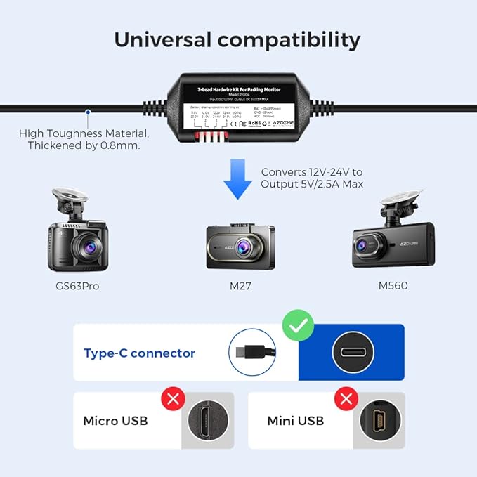 Compatible for AZDOME M27 Dash Cam with USB Type C: 11.5ft Type C USB Hardwire Kit for dash cam or... Read more
