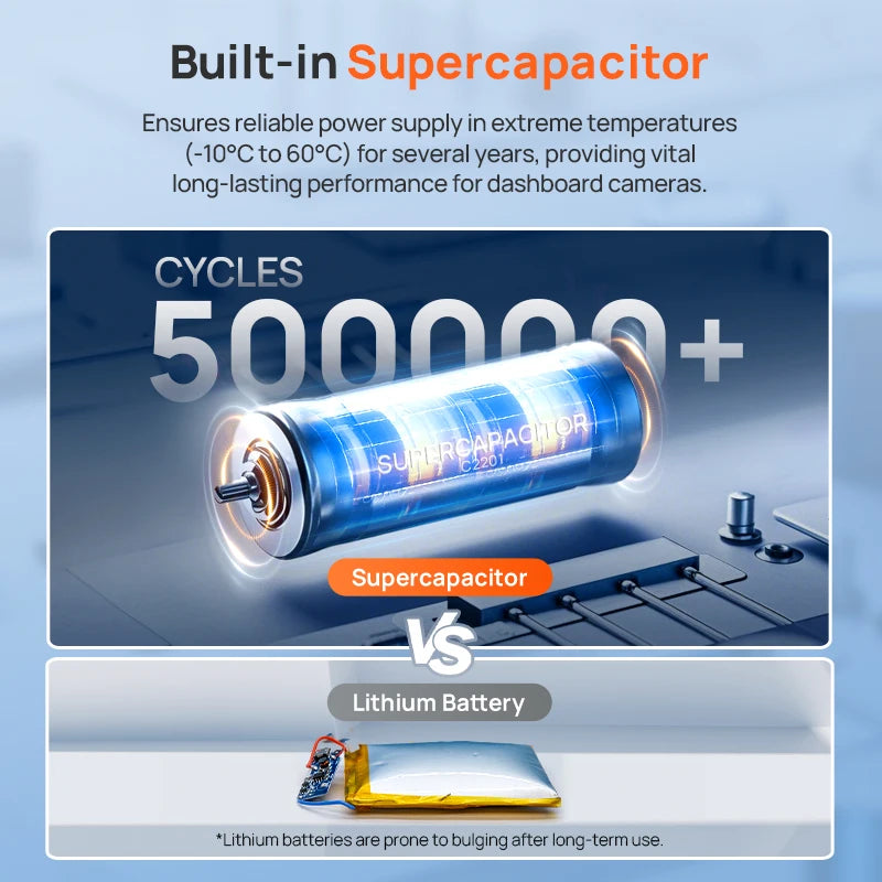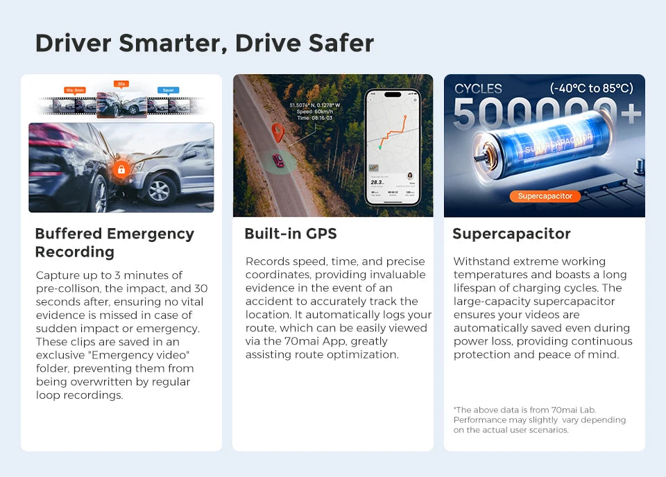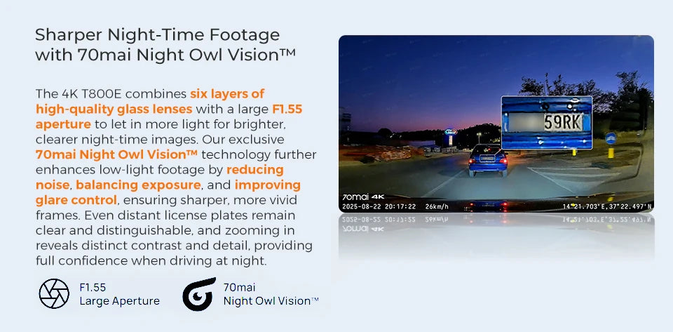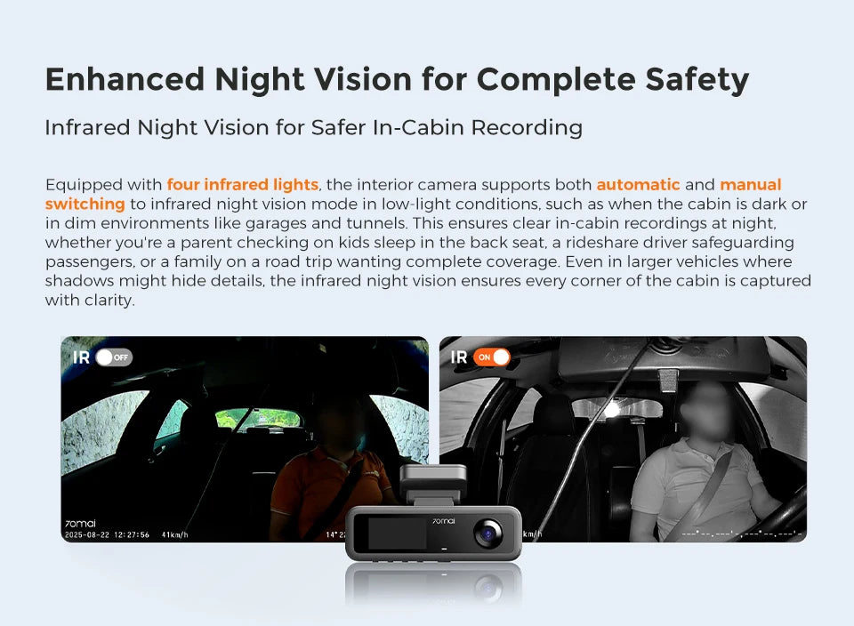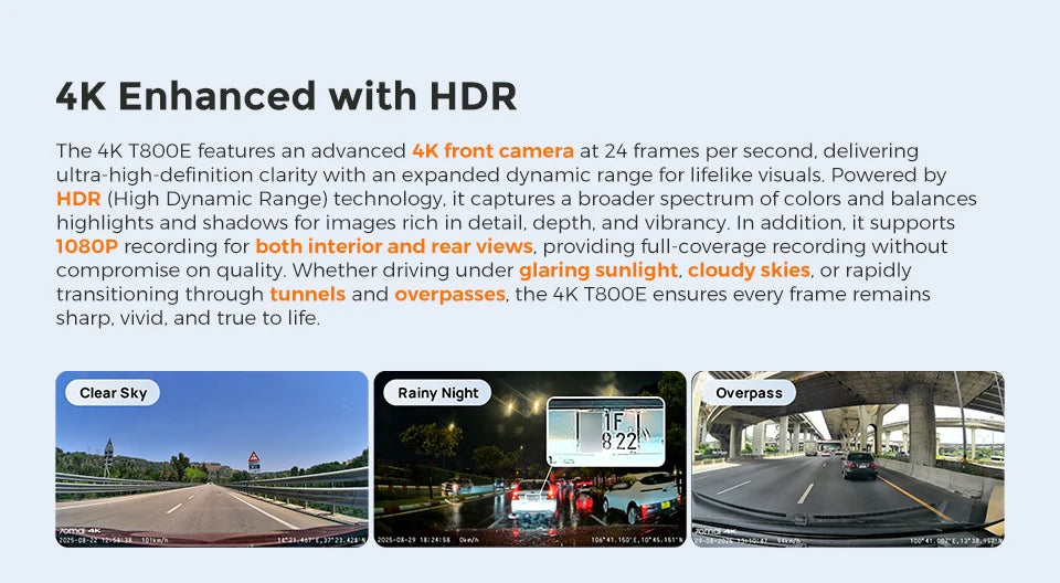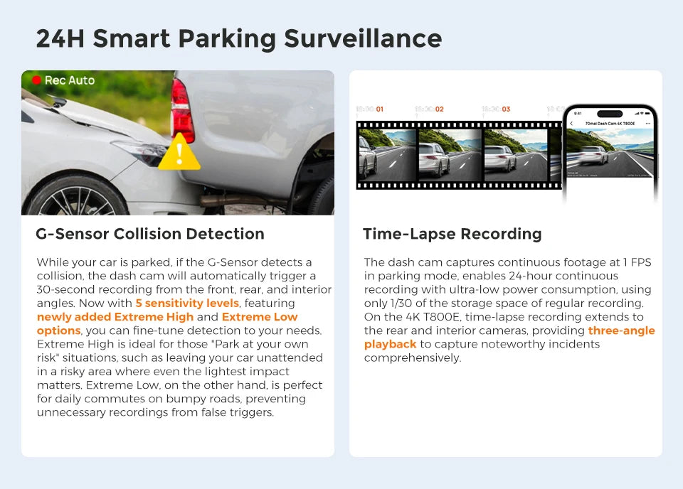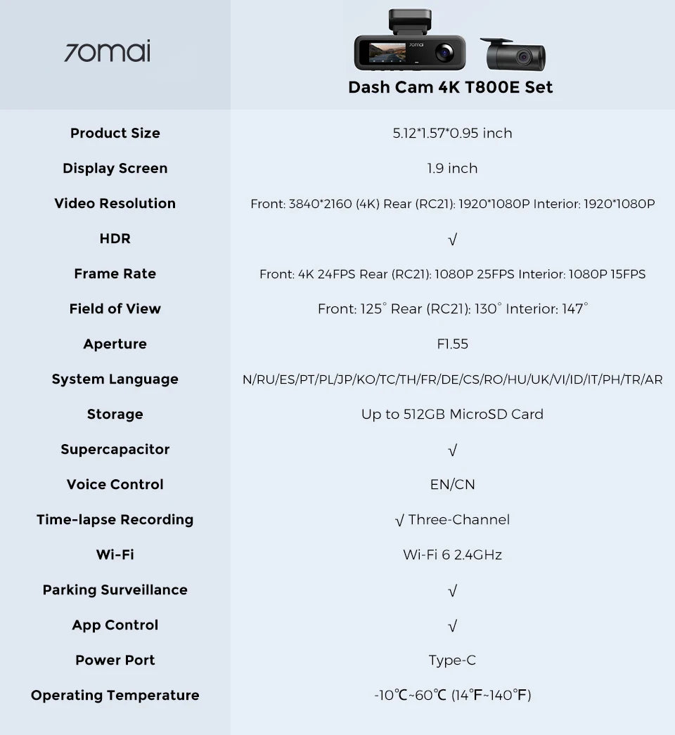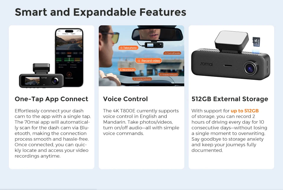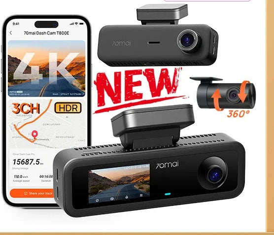 DIBELLAY 70mai T800E 4K 3-Channel Dash Cam – Front/Rear/Interior, Voice Control, 24h Parking, GPS,
