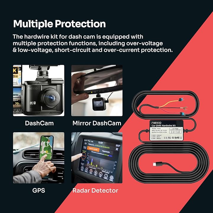 · NEXIO 3-Lead ACC Mini-USB Port Hardwire Kit - This allows the Dash Cam to be installed in your vehicle without the need to use the 12V/24V outlet (car cigarette socket). Converts 12V-24V to Output 5V/2.5A Max.